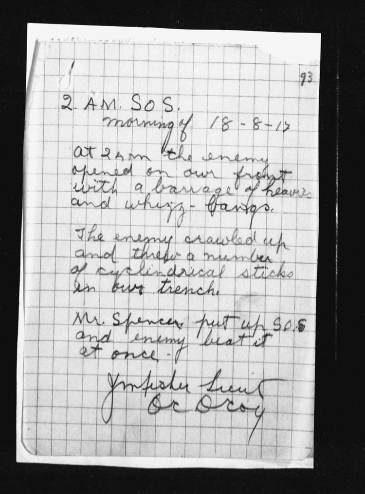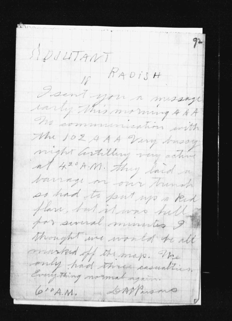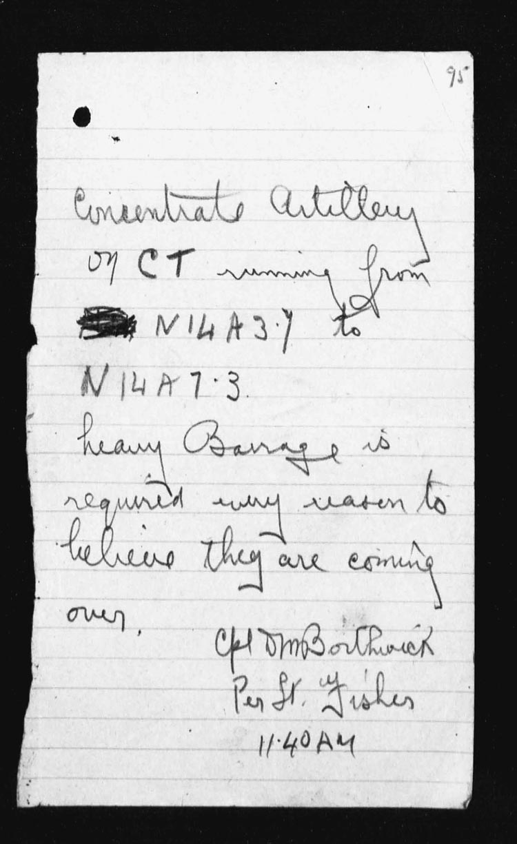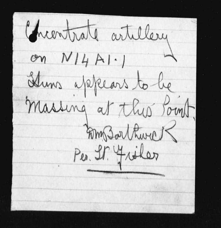 Lieut. Dougall then sent up his artillery signals and under cover of this fire succeeded in returning to our lines with only one casualty. There was no unusual activity during the remainder of the day. | ||