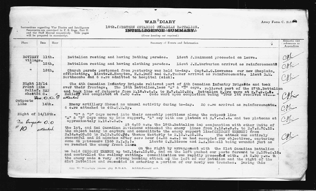 At 4.25 a.m. the 18th Battalion in conjunction with other Units of the 1st, and 2nd Canadian Divisions attacked the enemy lines from N.13.a.9.6. to N.7.70.15. the object being to capture and consolidate the enemy support line (CHICORY TRENCH) from N.14.a.05.55. to N.13.b.60.0. thence Westerly to N.13.b.05.35. The attack was entirely successful and 26 minutes after zero hour (4.25 a.m.) we occupied our objectives, capturing some 65 prisoners (165 P.I.R.).