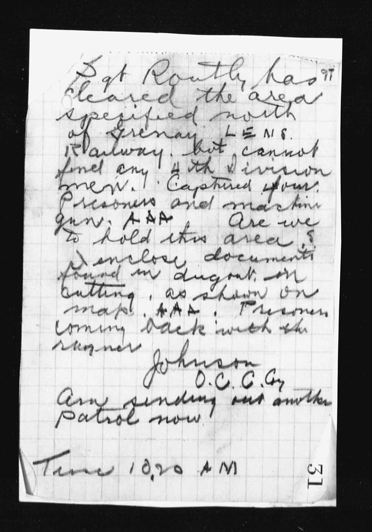 On roll-call at BOVIGNY village it was found that the 5 men who had been left in NO MAN’S LAND had not returned as reported by the Brigade, so a party under LIEUT. DOUGALL again went up to search for them.