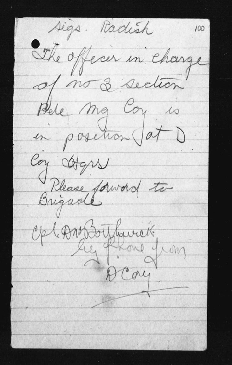 Upon the return of Lieut. Dougall and party a report came from the 4th Brigade H.Qrs that these missing men came in and had reported to another Regimental Aid post. | |