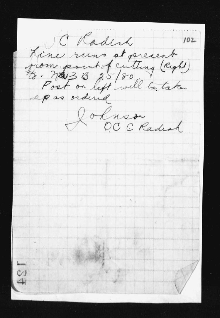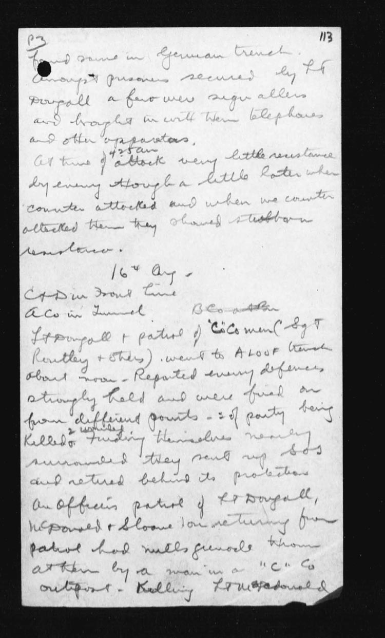 | 16 | About noon Lieut. Dougall, L.Sgt. C.E. Routley and 19 o.rs crossed the railway cutting at N.13.b.2.2 and went forward along COTTON TRENCH to N.13.b.5.0 where there were fired upon from ALOOF TRENCH and they could see that ALOOF trench was heavily held by the enemy. Turing about they went Westward along COTTON trench to N.13.c.70.95 where they again encountered an enemy party from the South, turning about again they found that an enemy party from ALOOF trench had followed them and they were practically surrounded.