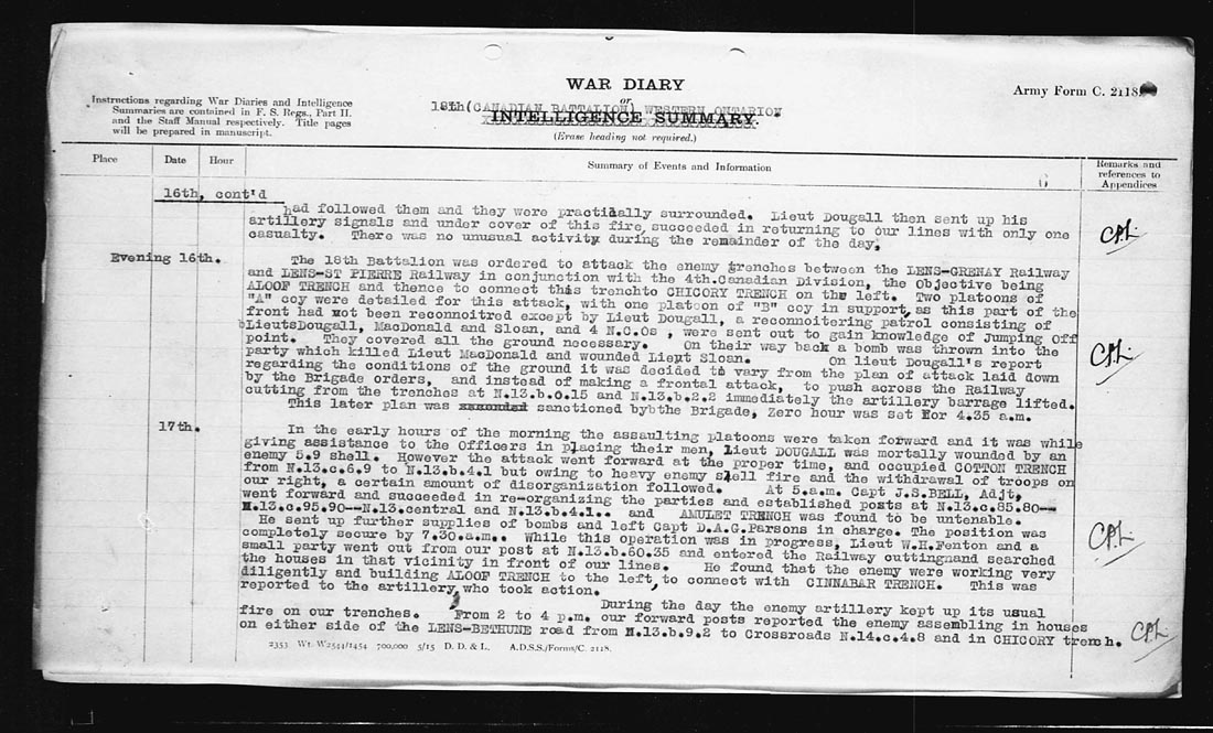 | Evening | 16th | The 18th Battalion was ordered to attack the enemy trenches between the LENS-GRENAY Railway and LENS-ST PIERRE Railway in conjunction with the 4th Canadian Division, the Objective being ALOOF TRENCH and thence to connect this trench to CHICORY TRENCH on the left. Two platoons of “A” coy where detailed for this attack, with one platoon of “B” coy in support, as this part of the font had not been reconnoitered except by Lieut. Dougall, a reconnoitering patrol consisting of Lieuts. Dougall, MacDonald, and Sloan, and 4 N.C.Os, where sent out to gain knowledge of Jumping Off point. They covered all the ground necessary.
