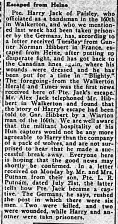 Pte. Harry Jack of Paisely, who officiated as a bandsman in the 160th in Walkerton, and who we mentioned last week had been taken prisoner by the Germans, has, according to a letter from Gunner Norman Hibbert[iii] in France, escaped from [the] Henie, after putting up a desperate fight, and had got back to the Canadian lines again, where his wounds were dressed and he has been put for a time in “Blighty.” The forgoing from the Walkerton Herald and Times was the first news received here of Pte. Jack’s escape. Mr. Alex Jack telephoned Mr. Hibbert of Walkerton and found that the story of Harry’s escape had been told to Gnr. Hibbert by a Wiarton man of the 160th. We are all aware that the militant hospitality of his Hun captors would not be any more agreeable to Harry that the company of a pack of wolves, and are not surprised to hear that he made a successful break away. Everyone here is hoping that the good news may shortly be confirmed. In a letter received Monday by Mr. and Mrs. Putnam from their son, Pte. L.R. Putman, dated July 21st, the latter tells how Pte. Jack became a captive. The Germans, he says, rushed the post in which there were six men. Two were killed, and two were wounded, while Harry and another were taken prisoners.