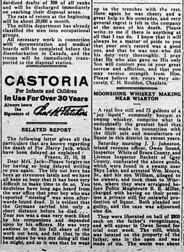 Thus, Private Harry Jack’s loss would be honoured at a memorial service, reported in the Paisley Advocate on September 1, 1918. The first page 2-column article related the deaths of Private Jacks and two other Paisley boys and how all three of them where members of the Boy Scouts and all three of them, Privates Jack McLeod[v], Harry Jack, and Gladstone MacGregor, were employees of Ballachey, Laidlaw & Company. “The large church edifice was crowded, the seats being occupied more fully than at any service for many years past,” indicated the high level of community support and sympathy for the fallen in this small rural town.