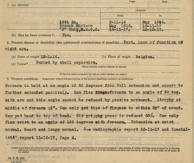 On December 26, 1917 a Medical Board is convened reviewing the circumstances and medical status of Private McLennan’s wounds and determines that his wound is of a permanent nature and that it occurred in the line of duty and would it would degrade is ability to earn a living in the untrained labour market by 30 percent. This is the last of several medical board reviews. This is atypical of a soldier’s discharge. In most cases a medical board in convened in England determining the medical condition that exists for the soldier requires discharge and then a final medical board upon discharge his held. It often confirms the first board’s findings and decides as to the extent of compensation the soldier is eligible for.