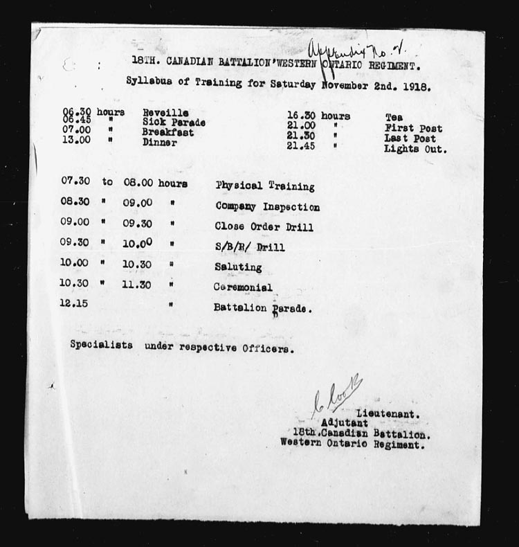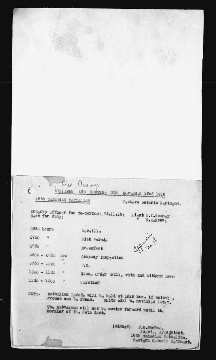 | 22 | Battalion training per syllabi attached. Lt.-Col. L.E. Jones, Lieut. J.H. Barkley & 17 O.R’s retd from leave. 1 O.R. arrived as reinforcement. 1 O.R. retd from Course. Appendix No. 18. | ||