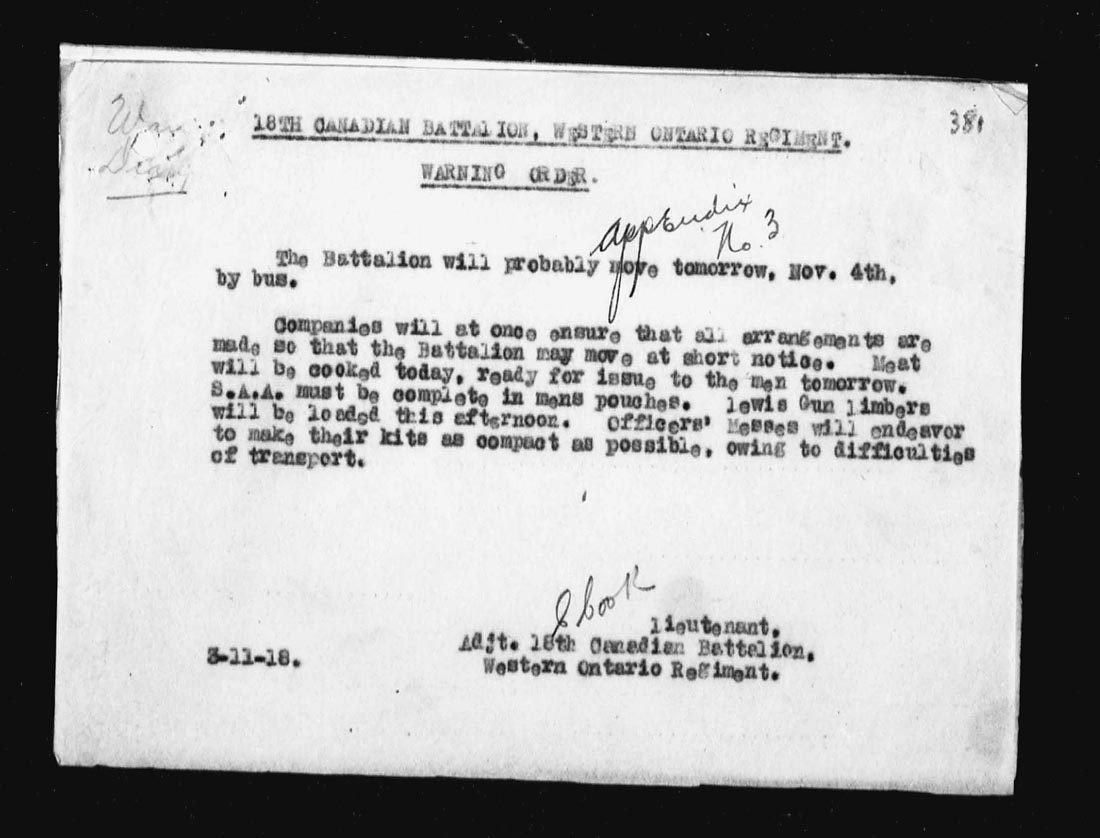 | 3 | Battalion Church Parade at 10.00 a.m. on Battalion Parade Ground. Anticipating a move on the 4th inst. Preparations were made in the afternoon re. loading of Lewis Guns etc. Warning order attached, appendix No. 3. | ||