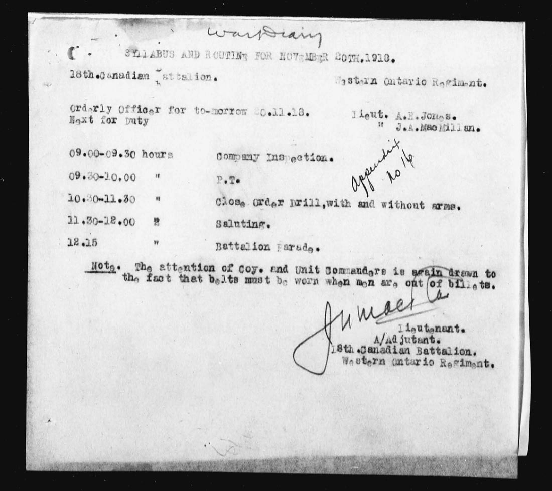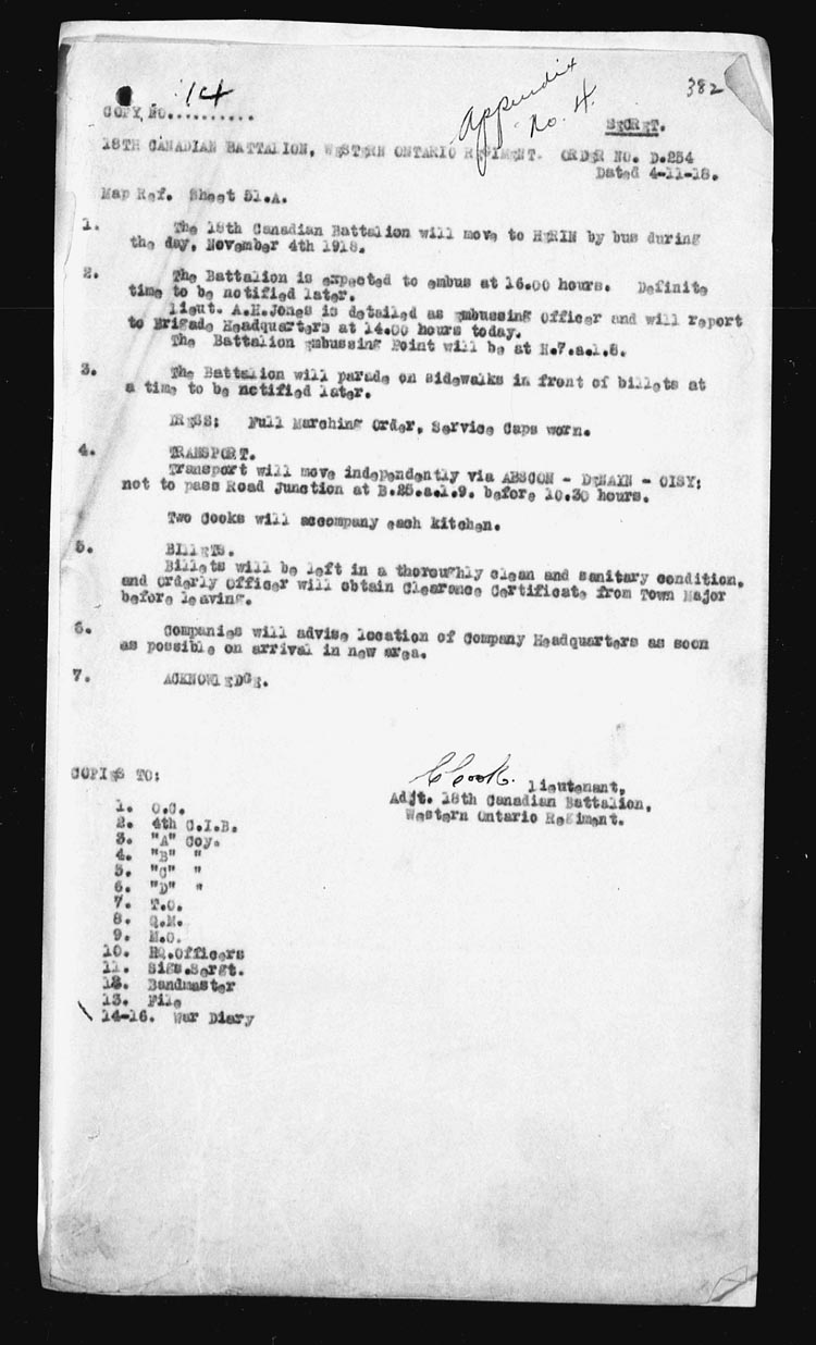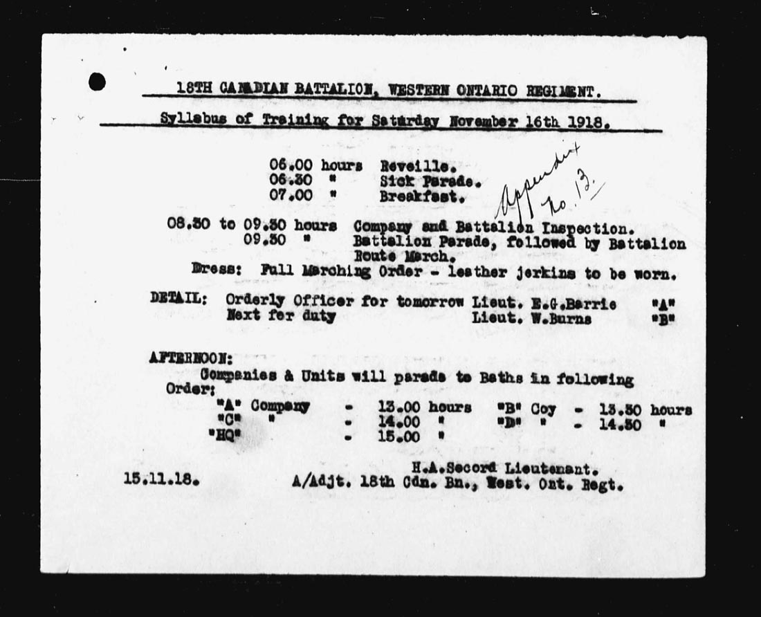 | 16 | Battalion training per syllabi attached. Bathe parades were held during the afternoon at Q.25 central, a large mine building near CIPLY Station. 4 O.R’s proceeded on leave. Appendix No. 13. | ||