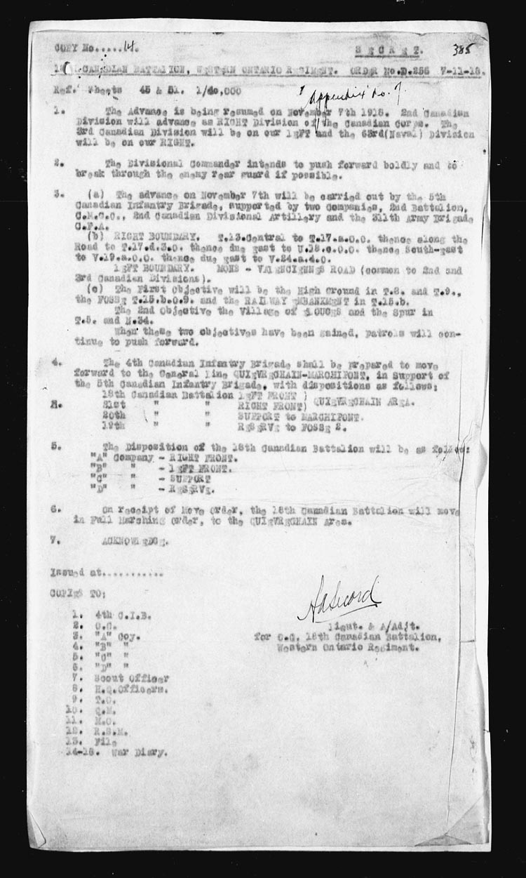 J.2-04.85 VALENCIENNES 12. | 9 | The Battalion moved off in Fighting Order at dawn over jumped over the 25th Canadian Battalion between ELOUGES and WASMES and met no opposition as they moved along to FRAMERIERES where Battalion Hdqrs., was established. Rear details moved off at 10.00 hours and marched via DOUR – PETIT WASMES – PATURAGS to FRAMERIERES. The people along the route overjoyed to be free again, cheered the troops as they passed along, loading them down with flowers and victuals of all kinds. During the night the Battalion pushed forward and established a line of posts through NORCHAIN. 1 O.R. arrived as a reinforcement. 1 O.R. from hospital. | |