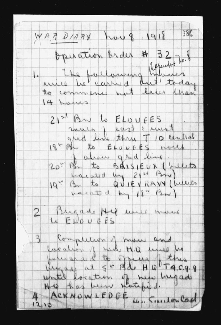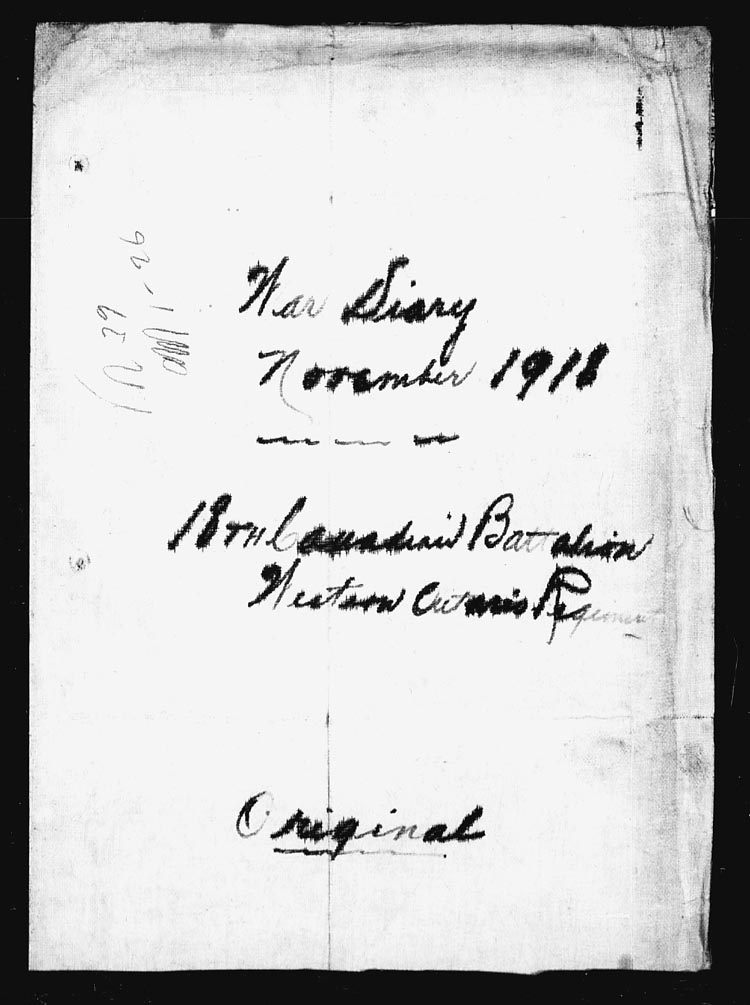 | 11 | At 07.25 hours a wire was received from Brigade stating that hostilities would cease at 11.00 hours that day and for the Battalion to stand fast at the line reached at that hour. The Battalion forward post at the cessation of hostilities was at Q.19.d.30.40. (Sheet 45.) A Battalion parade was held at 11.30 hours. Major Bell congratulated the Battalion on its fine work during recent operations. As an appreciation, the Mayor, on behalf of the village of CIPLY, presented the Battalion with a Belgian Flag. Lieut. A.T. Fergusson and 2 O.R’s retd from leave. 1 O.R. retd from Course. 13 O.R’s retd from hospital. 1 O.R. Wounded-Gassed. | ||
