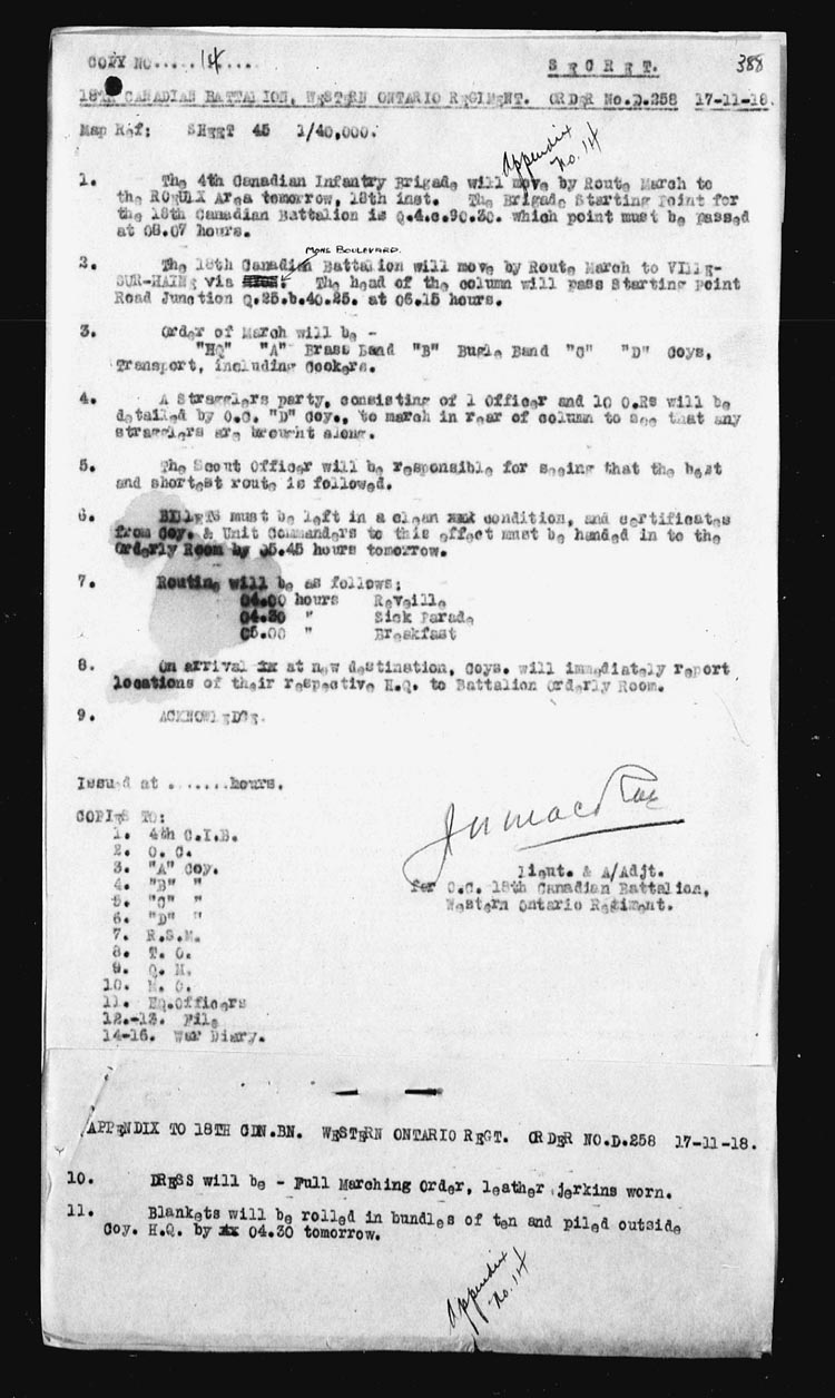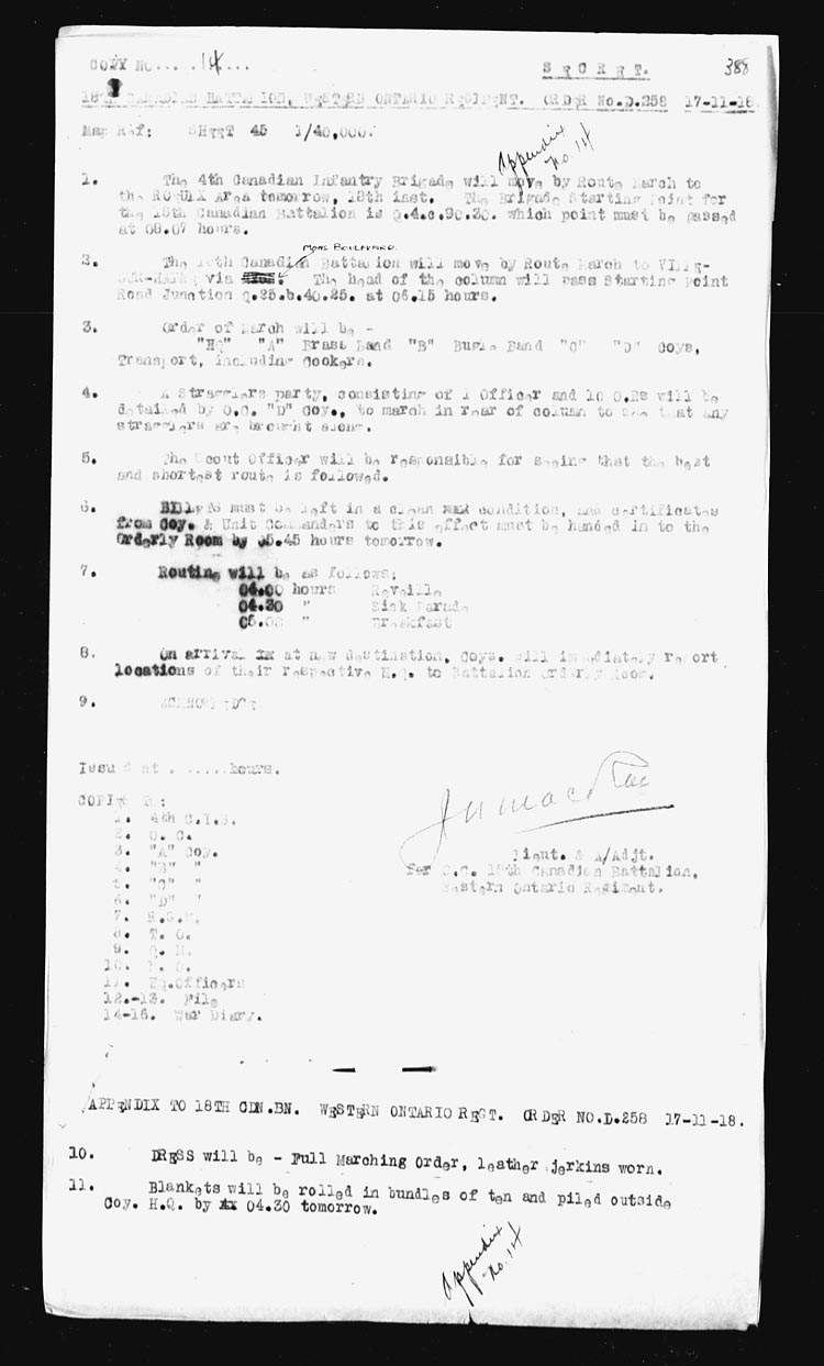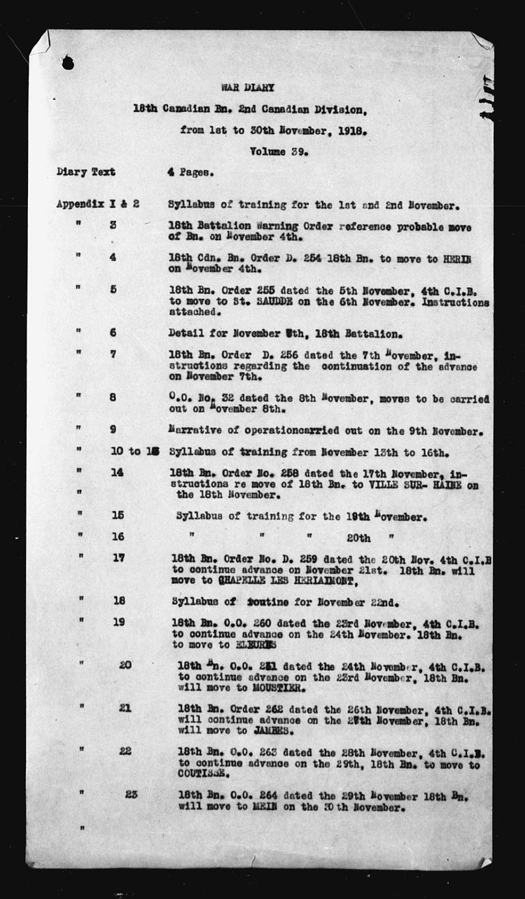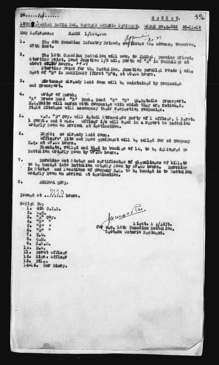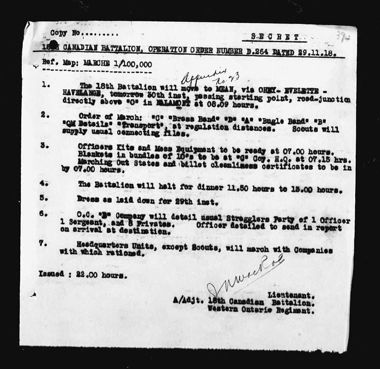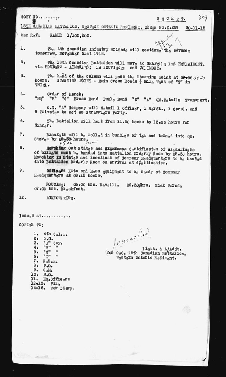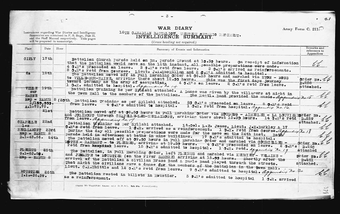 Map – NAMUR 1/100,000. A.1.75.75 | 18 | The Battalion moved off in Full Marching Order at 06.15 hours and marched via HYON – MONS to VILLE-SUR-HAINE arriving about 12.00 hours. This was the first days journey toward Germany as the army of occupation. 4 O.R’s on leave. 2 O.R’s retd from leave. 1 O.R. admitted to hospital. Appendix No. 14. | |