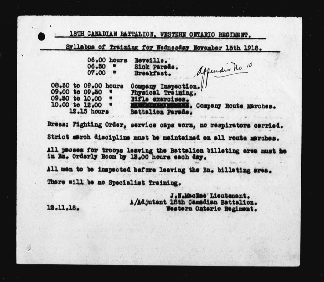 | 15 | Battalion training per syllabi attached. Lieut. R.R. Hartry and 6 O.R’s proceeded on leave. 2 O.R’s arrived as reinforcements. 7 O.R’s retd from hospital. Appendix No. 12. | ||