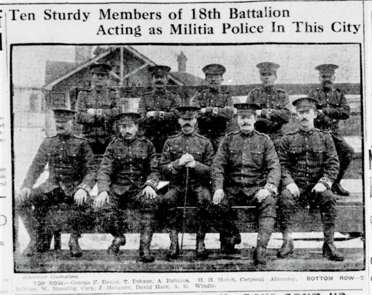 They were not formal members of the Provost Corps, or its Canadian equivalent, but had been tasked with the responsibilities of military good order and conduct at a battalion level, in this case the 18th Battalion, CEF, stationed and training at London, Ontario during October 1914 to April 1915.