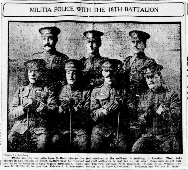 They were not formal members of the Provost Corps, or its Canadian equivalent, but had been tasked with the responsibilities of military good order and conduct at a battalion level, in this case the 18th Battalion, CEF, stationed and training at London, Ontario during October 1914 to April 1915.