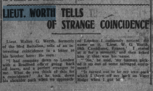 “I had company down to London with a Bradford officer going back off leave, and a perfect stranger to me. What do you think of this for a coincidence? As he took down his shoulder pack when we approached London I suddenly noticed my name on it. ‘Lieut. W.G. Worth, 18th Canadians, France.’ I stared at it for a moment, and then asked him his that was his name.