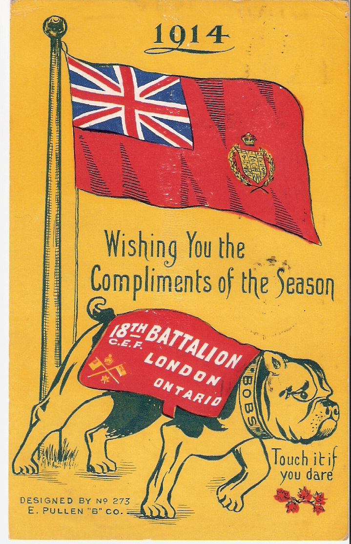 The 18th Battalion experienced Christmas as a unit from 1914 to 1918. Each Christmas was a different experience for each year. The first Christmas was a gala event in London, Ontario and hosted by The Women’s Canadian Club replete with boiled ham, mashed potatoes, and green peas. The following Christmases would not be the same and the soldiers celebrating the season comprised of different cadres of men as the toil and spoil of war took its toll.