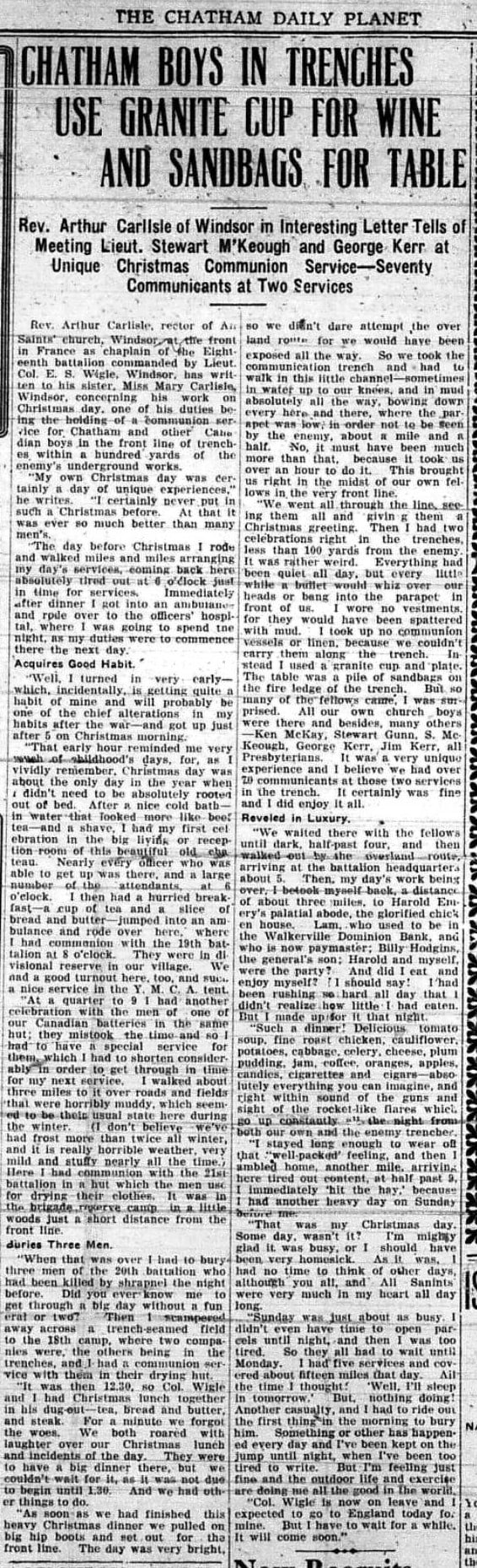‘Rev. Arthur Carlisle of Windsor in Interesting Letter Tells Meeting Lieut. Stewart M’Keough and George Kerr at Unique Christmas Communion Service—Seventy Communicants at Two Services