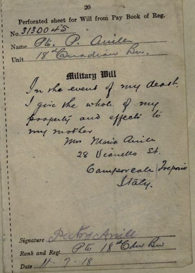In contrast, Anile was an immigrant new to Canada. His presence in Canada during the war and the terms of the MSA established his eligibility for service as a conscript in the Canadian Expeditionary Forces. We know little of his life up until he is conscripted. His forename is Pasquale and is either adapted by him or changed by others to Patsy. He is the son of Giuseppe and Maria Anile of 28 Camporeale, Trapani, Sicily.