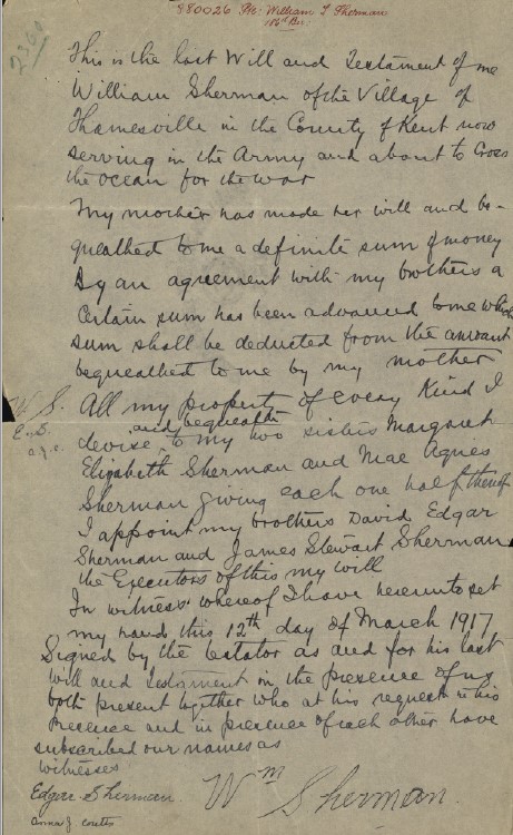 They were 5-years different in age. The elder of the two, William Tecumseh Sherman, as a 28-year-old painter when he enlisted with the 186th Overseas Battalion at Chatham, Ontario on February 10, 1916. With his enlistment he passed through his service with an expectation of overseas service. He was not quite an exemplary example of military discipline as he was subject to 14-day’s of being confined to barracks over four incidents. His service record does not allow us to see the behaviour that brought this punishment to fruition. However, once overseas, save for a spot of trouble with a social disease, his service file is devoid of any issues involving disciplinary action by the military authorities.