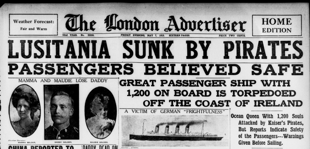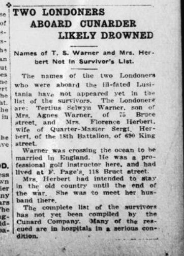 For RQMS Herbert his worst fears would be founded as the news of the May 7 sinking would have been front page news the next day and he could not have missed the electrifying news as it was shared amongst the men of the 18th Battalion, some of which would be aware of the nature of Herbert’s loss. The London Advertiser headline for May 7 was “LUSITANIA SUNK BY PIRATES” shows the rapidity that such news travelled. The Lusitania had sunk 18-minutes after being struck by a German U-boat torpedo at 2:10 PM local time. With the time zone difference of 5 hours the London Advertiser was able to report of the sinking in its evening addition. This edition stated that two Londoners were aboard the Lusitania, Florence Herbert and local golf pro Tertias Selwyn Warner. On the very next day the London Advertiser would print a story that both residents had “…likely drowned.” Their prediction was correct.