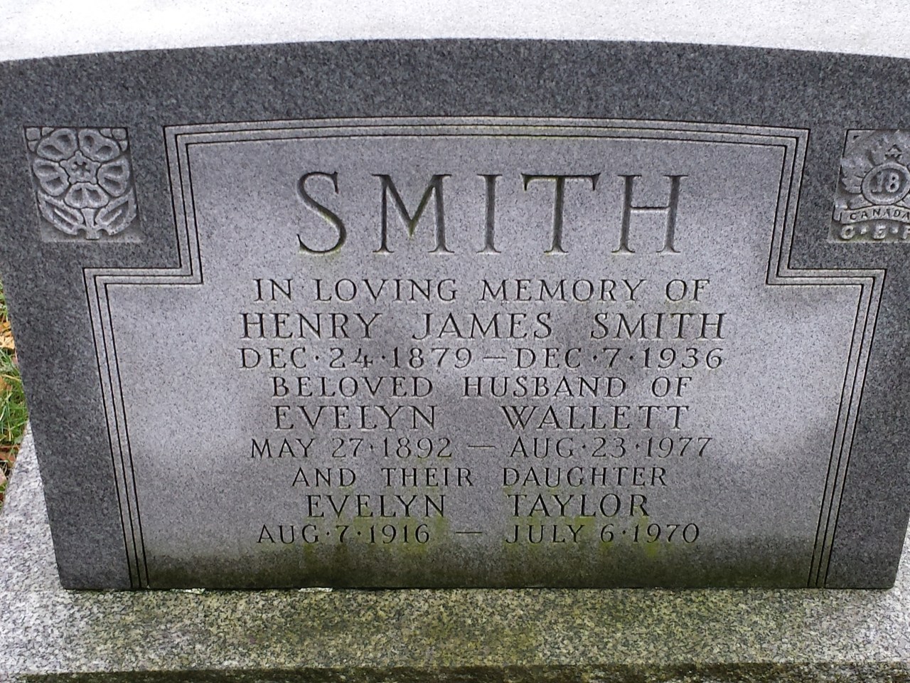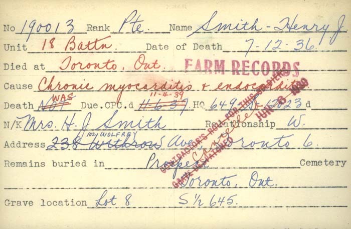 On April 4, 1919, Smith was discharged from the CEF after requiring more treatment for the wounds he sustained in action in France. He would return to his family in Iona, Ontario and at some point move to Toronto, Ontario. He died on December 7, 1936, as the clouds of another war were forming. His Veterans Death Card indicates his death was attributable to his service in the war. He rests peacefully with his wife (Evelyn Wallet died August 23, 1977) and his daughter Evelyn Taylor (August 7, 1916-July 6, 1970) at Prospect Cemetery, Toronto, Ontario.