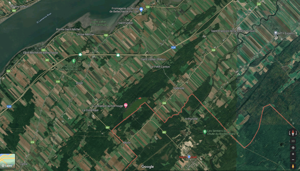 There is a line in a letter penned by an 186th Battalion soldier as he travelled by train along a similar route as the 18th Battalion did. His letter written on 22 March 1917, and he speaks of the farm country of being poor. He may have been speaking of the area just before the area that Saint-Raphaël because the farm region in this vicinity is simply beautiful. The land runs relatively flat from the St. Lawrence to the beginning of low hills with mixed trees. You can see from the image below the organized intensity of the agriculture being practised here. The farms I saw are incredibly neat, tidy, and well organized. There appears to be little wasted land that is not being utilized with some type of crop. Corn, hay, and other crops abound, and the land looks rich and fertile and is well tended by the farmers in the region.