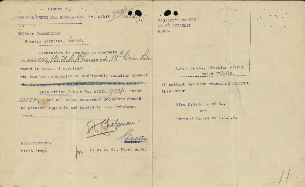 He would serve with the 18th Battalion until a fateful day. On 20 April 1917 he was accidentally wounded “in the field” (fracture to his tibia) and transferred from No. 4 Canadian Field Ambulance to No. 58 Casualty Clearing Station the next day. It appears he was held at this unit and on 15 May 1917 was subject to a Field General Court Martial for “When on active service, conduct to the prejudice of good order and military discipline, (negligently wounding himself in the left leg) 20 April 1917”. He was sentenced to 30-days Field Punishment No. 1 and the sentence was confirmed by the Acting Adjutant General (AAG), 1st Army 2-days later.