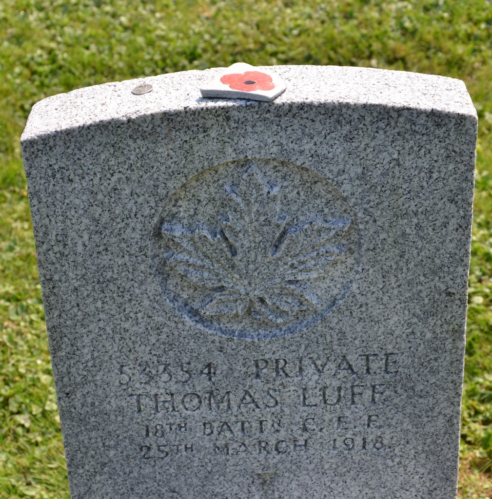 Private Luff is buried at Saint John (Fernhill) Cemetery in the Field of Honour at Grave no. 15. He rests with 102 other fallen from Canada and the Commonwealth. On the visit to his grave someone had left a small token on the to of the gravestone and it was oddly comforting to the author to see that someone else had come to his grave and presented tangible recognition to his service.