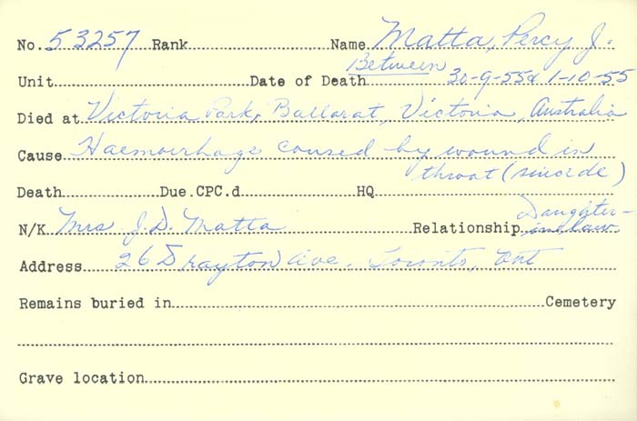 But Matta’s death did not go completely unnoticed as the wheels of government bureaucracy churned and eventually his service file was updated with the words “Deceased Between – 30-9-55 and 1-10-55” in red pen on his Proceedings of Discharge form. A Veterans Death Card was issued and it recorded the cause as “Hemorrhage caused by wound in throat (suicide).” And that his next-of-kin was a Mrs. J.D. Matta, a daughter-in-law, residing at 26 [Drayton] Avenue, Toronto, Ontario.