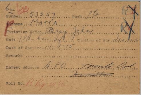 One such case involves Private Percy John Matta, regimental number 53257 of the 18th Battalion, Canadian Expeditionary Force (CEF).