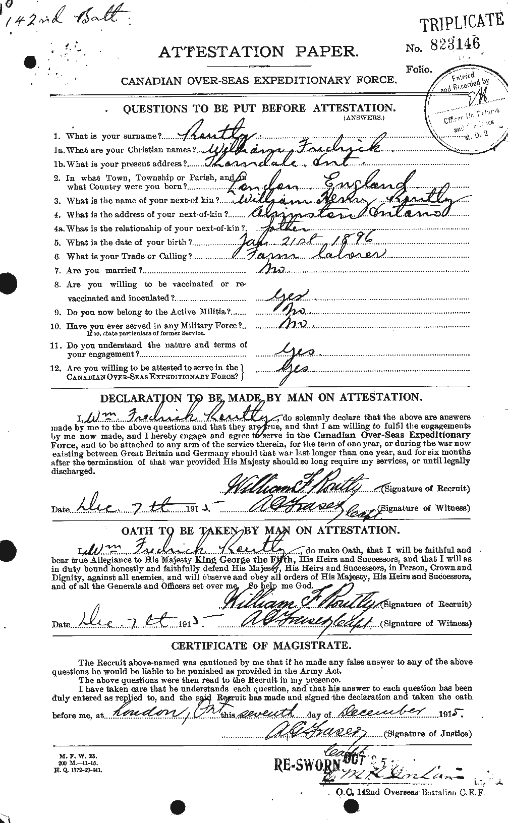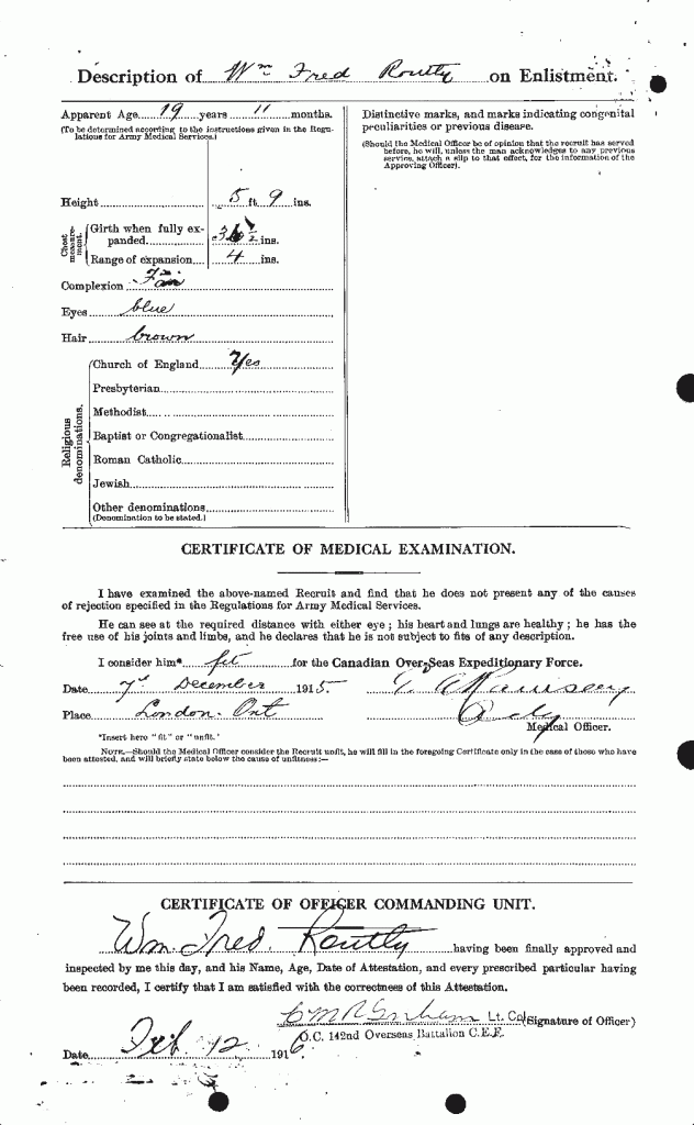 [ii] Both men attested on the same day, 7 December 1915 at London Ontario with the 142nd Battalion. Will’s regimental number was 823146 and John’s was 823145. They literally were standing in line beside each other and, as friends, they decided to enlist together.