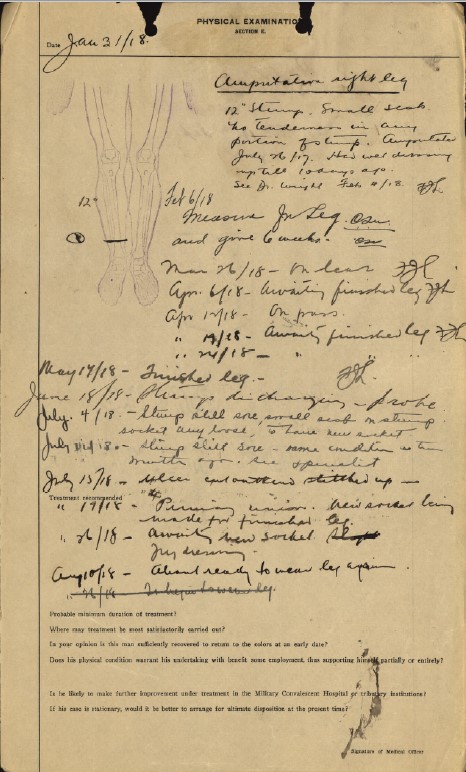 By March 21, the prosthetic department at Davisville Military Hospital, Toronto had fitted Will with an artificial leg “in the rough”. For her birthday on April 23, Flo received a gold watch, Will having left the parcel previously with her mother. On May 18, Will went gaily downtown to celebrate the mobility of the new artificial leg. The unaccustomed pressures on the stump brought a painful end to the jaunt. He returned to suburban Toronto by streetcar, leaning on the shoulder of his chum.