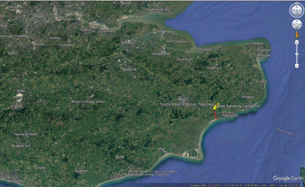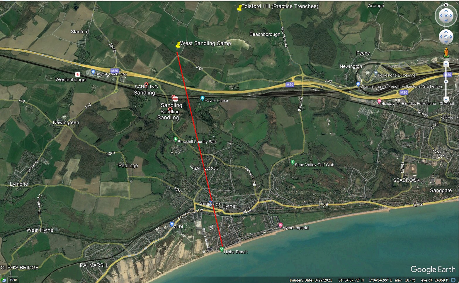 West Sandling Camp was located near Cowtye Road with Tolsford Hill being immediately north-east of the camp. Today the M20 divides the location of the camp with the town of Sandling and it was approximately 2.5 statute miles to Hythe Beach. The fastest way to the beach would be a walk from the camp south-west on what is now the A20 to the Sandling Road. Following that road it turns into School Road, then Tanner’s Hill then east along the current A259 to Twiss Road and south to the beach.