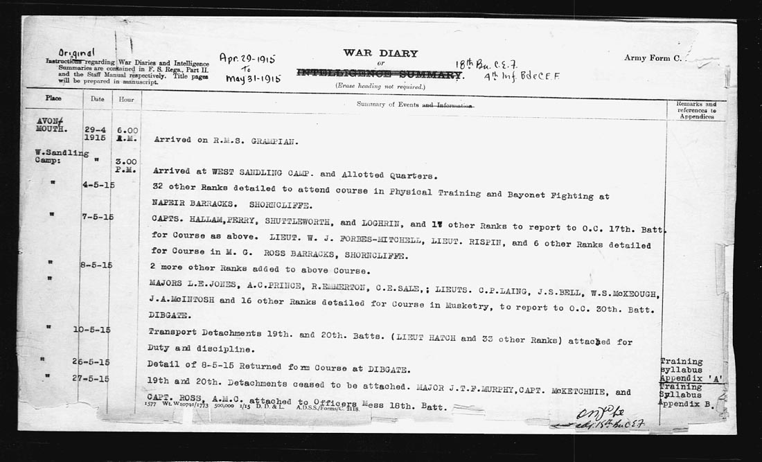 The 18th Battalion trained in England from May to September 1915. It was based at West Sandling Camp near Shorncliffe Military Base and the 18th Battalion War Diary does not do a good job in relating the activities of the soldiers while they trained there. It is epic in its brevity. Twenty-five of May’s diary entries are blank.