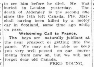 The news of the death of Corporal Alf. Aldersley in a London hospital, was received with genuine regret by the London boys, for he as a good pal. Under the heading of “Arrived Too Late” this morning’s Daily Mirror published on the front page a picture of our late comrade and his widow family with the information that they had arrived from Canada too late to see him before he died. He was buried in London yesterday. The death of Aldersley is the second one since the 18th left Canada, Pte. Marshall having been killed by a motor car in Scotland, some time ago while on a pass.