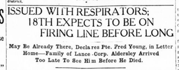 Young’s description mixes this news with the required implementation of “respirators”, or gas masks, introduced to counter the German use of poison gas and Ypres in April of that year. These respirators were early versions of the mask, called “tube helmets”, were basically cloth hoods with vision ports like eyeglasses and a tube for breathing. They were impregnated with chemicals to counter the gas used by the Germans to asphyxiate and disable soldiers.