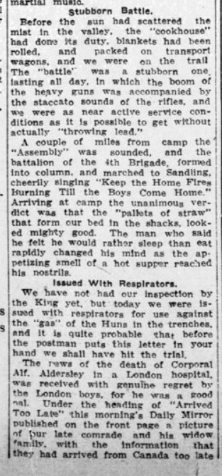 This letter is timely as it was published on 13 September 1915, just two days before the 18th Battalion, along with the 2nd Division, Canadian Expeditionary Forces, headed “overseas” to begin their service in Belgium in the Ypres Sector.