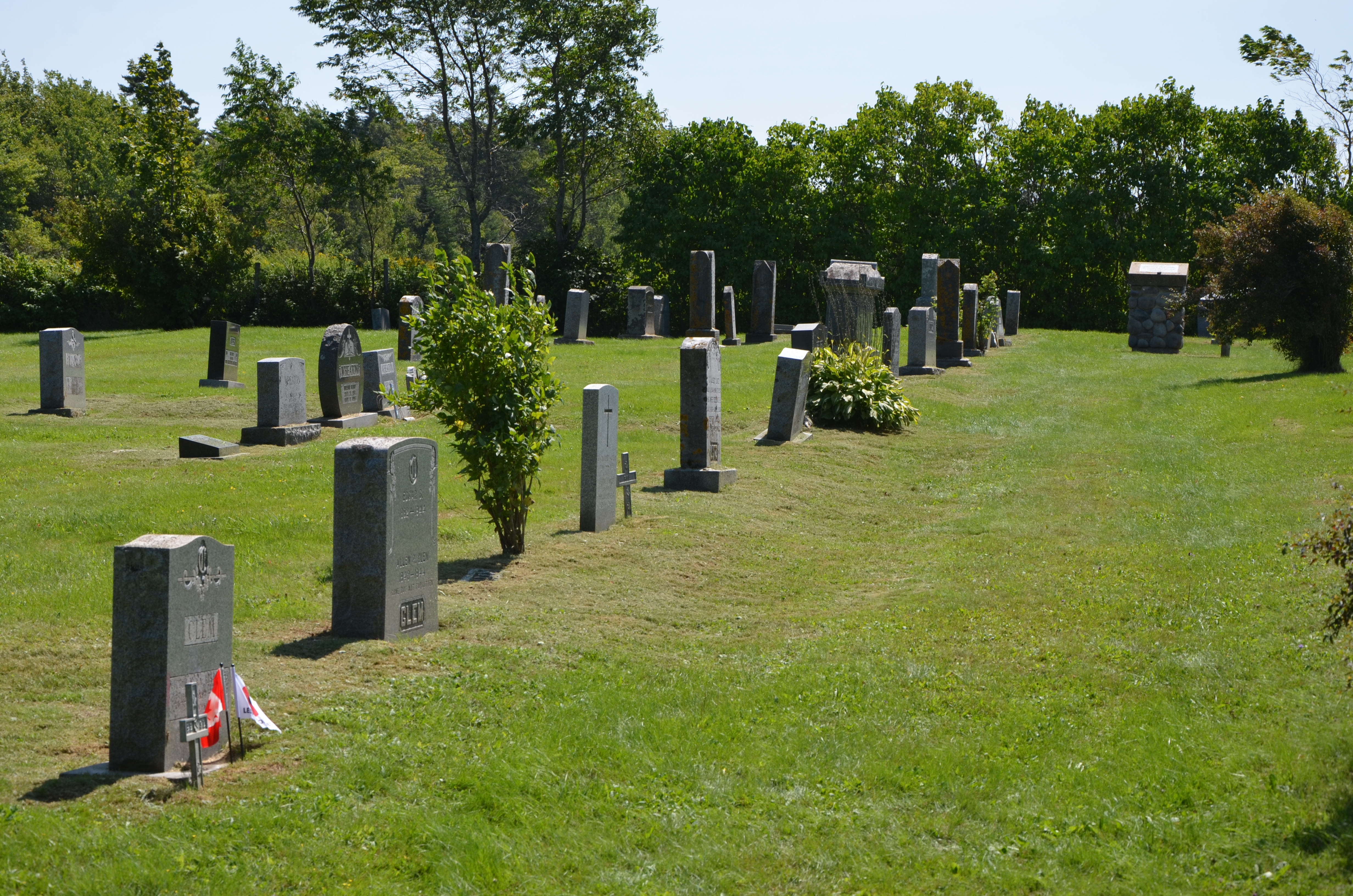 The cemetery is well maintained set in flat land and is divided by a gravel road. Access is easy and it is peaceful, save for the odd vehicle passing by. A corn field abuts the cemetery on the west side and a forest of deciduous trees on the east side.