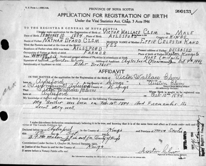 Victor W. Clem (Clemm) was born at the small community of Aylesford, Nova Scotia on 10 February 1894 to his father, Nathan Byard Clem (1855 – 1924) and Effie Celestria Rand (1857 – 1941). The delivery was attended to by a midwife.