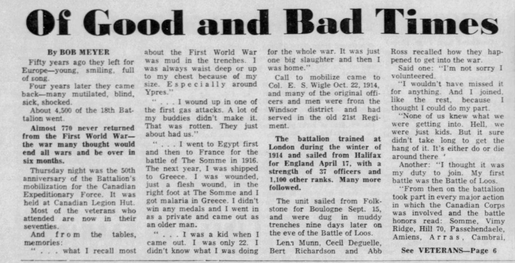 A short article offers quotes from the veterans attending and many of them are identifiable as members of the 18th Battalion and these men are well represented in the article with eight men being clearly identified as having served with the 18th Battalion. Of the eight, five of men are 18th Battalion “originals” having enlisted at the formation of the battalion between October 1914 and April 1915. Their regimental numbers are 5,000 series numbers. The other men came to the 18th Battalion after it was sent “overseas”[ii] to the Continent.