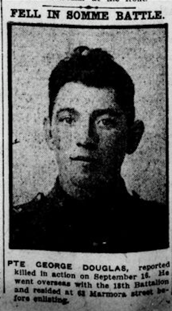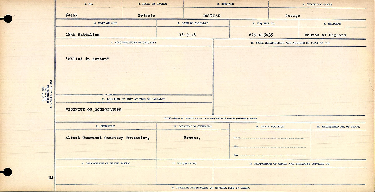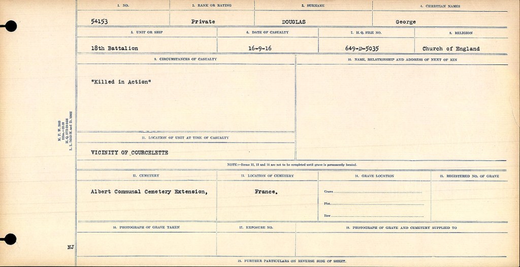 The Circumstances of Death Card for Private Douglas, reg. no. 54153 starkly relates that he “Killed in Action” in the vicinity of Courcelette on 16 September 1916 at the 18th Battalion’s first engagement at the Battle of Flers-Courcelette. The main attack occurred on the prior day and is noted in history for the first use of the modern battle innovation, the tank.