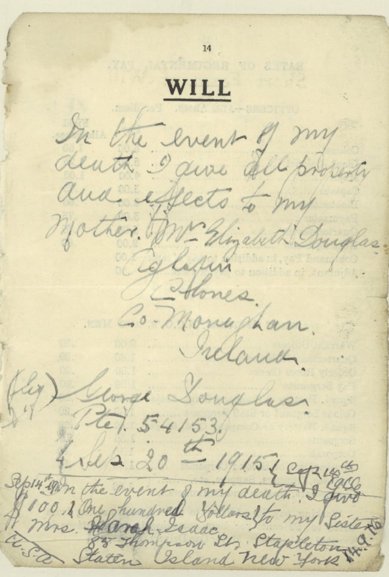 Private Douglas must have had a premonition that he was not going to make it. He amended his will[iv] on 14 September 1916, the day before the attack at Flers-Courcelette, to add his sister Sarah living on Staten Island, New York.
