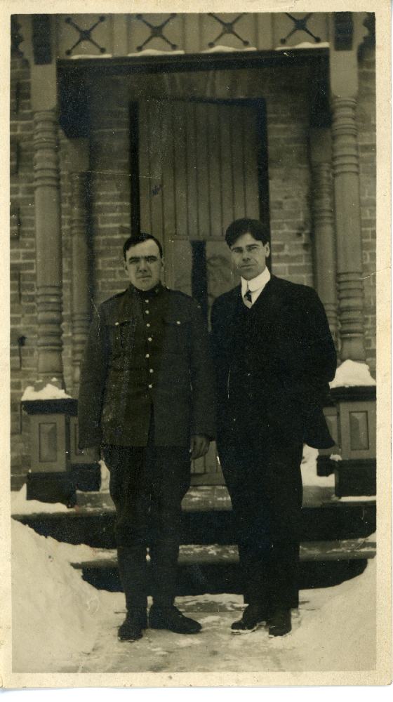 “Well, John, we’ve had a couple of good scraps since coming out, and I’m going to tell you the Germans have not much use for us. In both scraps we took quite a few prisoners, who are mighty glad to be made prisoners of war. Some come from Detroit and others from Toronto and some of them can talk as good English as I can. One of our scouts or snipers was talking to a prisoner with whom he had been personally acquainted before the war. The Germans had come down from Verdun for a rest, as they thought, but I guess it was for a scrap. Well, we got there first and got a couple of lines of trenches, which was easy. You can tell the 160th[viii] not to worry, as they will have some fun out here yet. I had some souvenirs, but did not bother carting them around, as we have enough to carry. The only souvenir I want to take home is myself. But a man knows not the hour or minute out here. Tell father I received the parcel yesterday and was mighty glad to get it. I see John Beaton[ix], Jack Devine[x] and Harold Marshall[xi] have enlisted. Well, they deserve credit. Gordon Daniels[xii] is fine and Jack McDougall[xiii] is just the same old Jack. Tom Babcock[xiv] was up to see us to-day. He is in a trench mortar battery out here. Andrew (Babcock[xv]) is Sergt. of the transport, and Sammy Tooke[xvi] is in the transport column. All the boys are fine.”