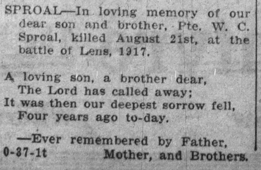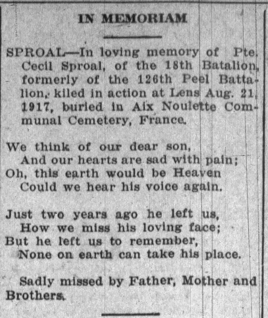 The Sproal family, father Thomas, mother Mary Ann, and his sister May[x], and brothers Charles, Albert, and John would grieve their lost son and brother. The Sproal family would print memorials in the Brampton Conservator on the anniversary of his death, starting on 22 August 1918. There are three memorial entries, and all express the family’s loss with a poem.