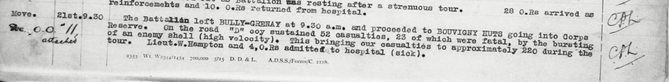 In the case of the friendship between Sproal and Burden, it may have begun before they were assigned to the 18th Battalion as replacements. They both were at Witley Camp some time before they departed for the Continent on 28 November 1916, as they are recorded to both have departed for their line battalion on that date. In addition, they arrived “in the field” on the same day, 29 November 1916.