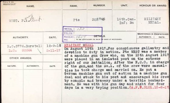 For conspicuous gallantry and devotion to duty in action. Pte WEST[ii] was a member of a machine gun [Lewis gun] Crew who, on the 15th August 1917 were placed in an isolated post on the extreme right of our Battalion. After the N.C.O. in charge of the gun, and the No. 1 of the crew were casualties he took charge and carried on. He put a German machine gun out of action in a machine gun duel and stuck to his post and encouraged his crew by example and bravery under a terrible bombardment. He was with his gun day and night for four days in a very trying position.