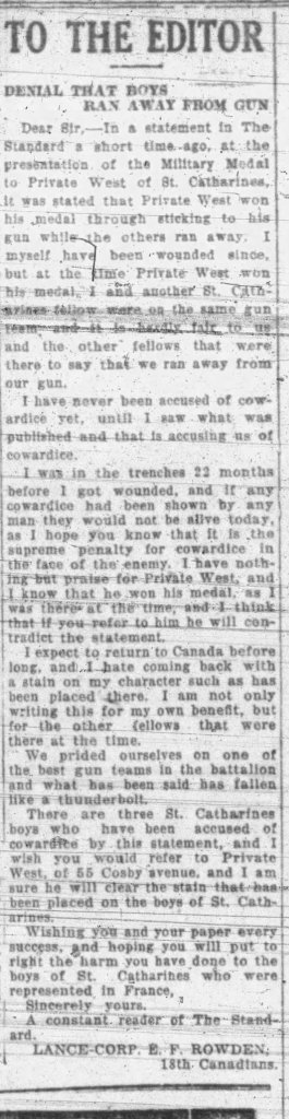 He wrote a scathing letter[x] to the Editor of The Standar,d published clearly stating that there were no acts of cowardice during the action. This fact was supported by a letter to the Editor published five days after Private Rowdon’s letter by Private West categorically stating there was no cowardice displayed by the men manning the Lewis machine gun. West praised and thanked the “boys who stood by me during 11 months’ fighting, particularly at Hill 70.” In addition, he states that information about the men fleeing “was not sanctioned by me, neither do I know from what source that information came.”