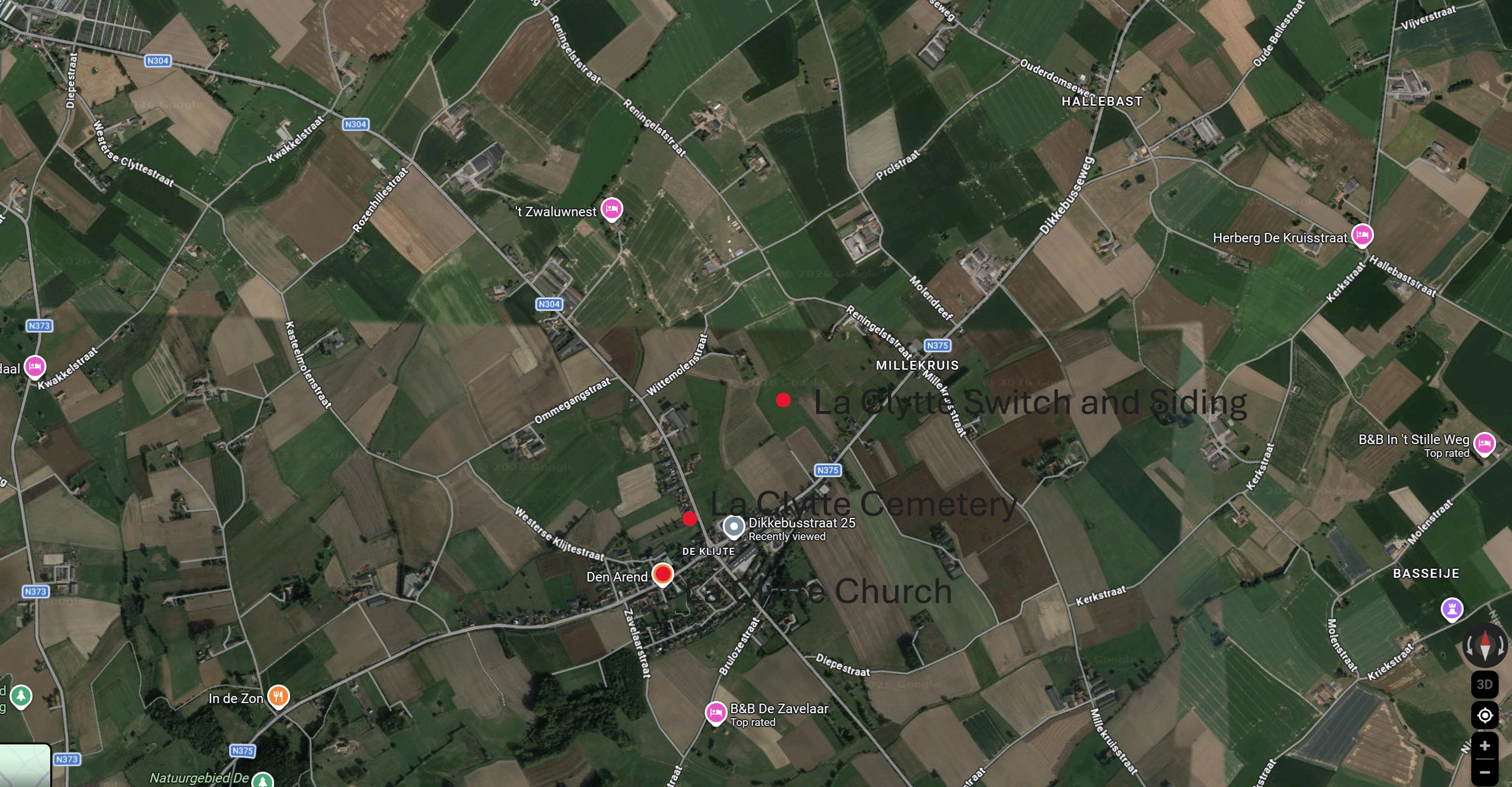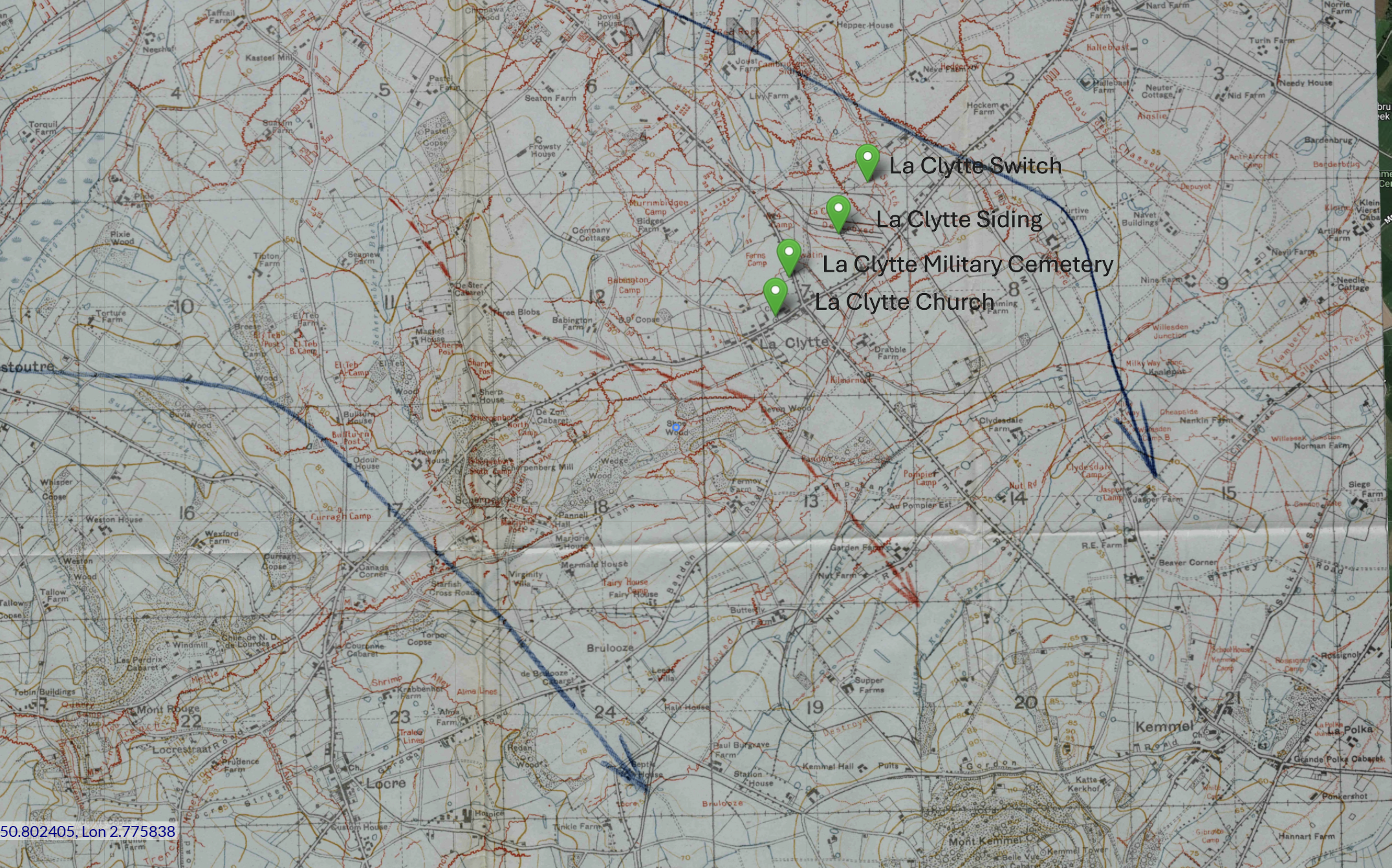 This is a comparison between the 1918 trench map (left) and Google Earth (2026) of La Clytte. The camps were located to the north-west of the village near the train siding and switch. The outskirts of Ypres are 6 KM to the north-west along the N375, which passes through the village from west to east.