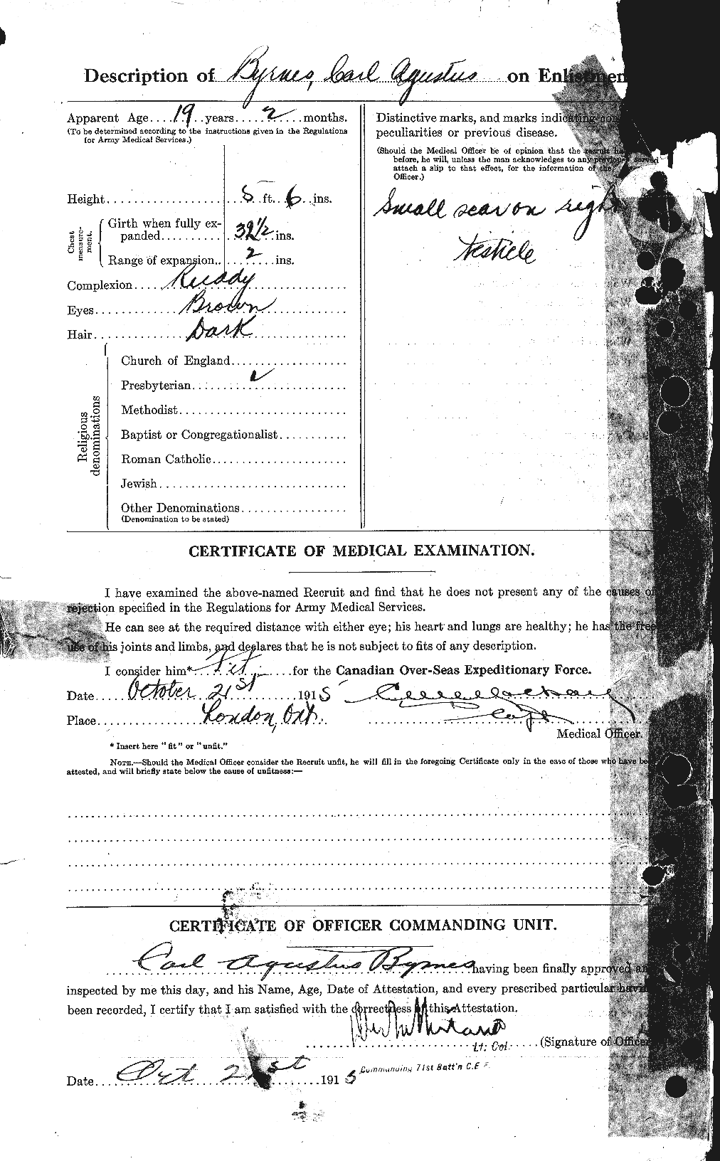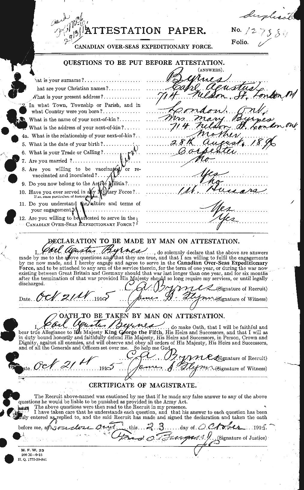 Attestation Papers: Give basic biographical information of the soldier on the date they joined the Canadian Forces.
