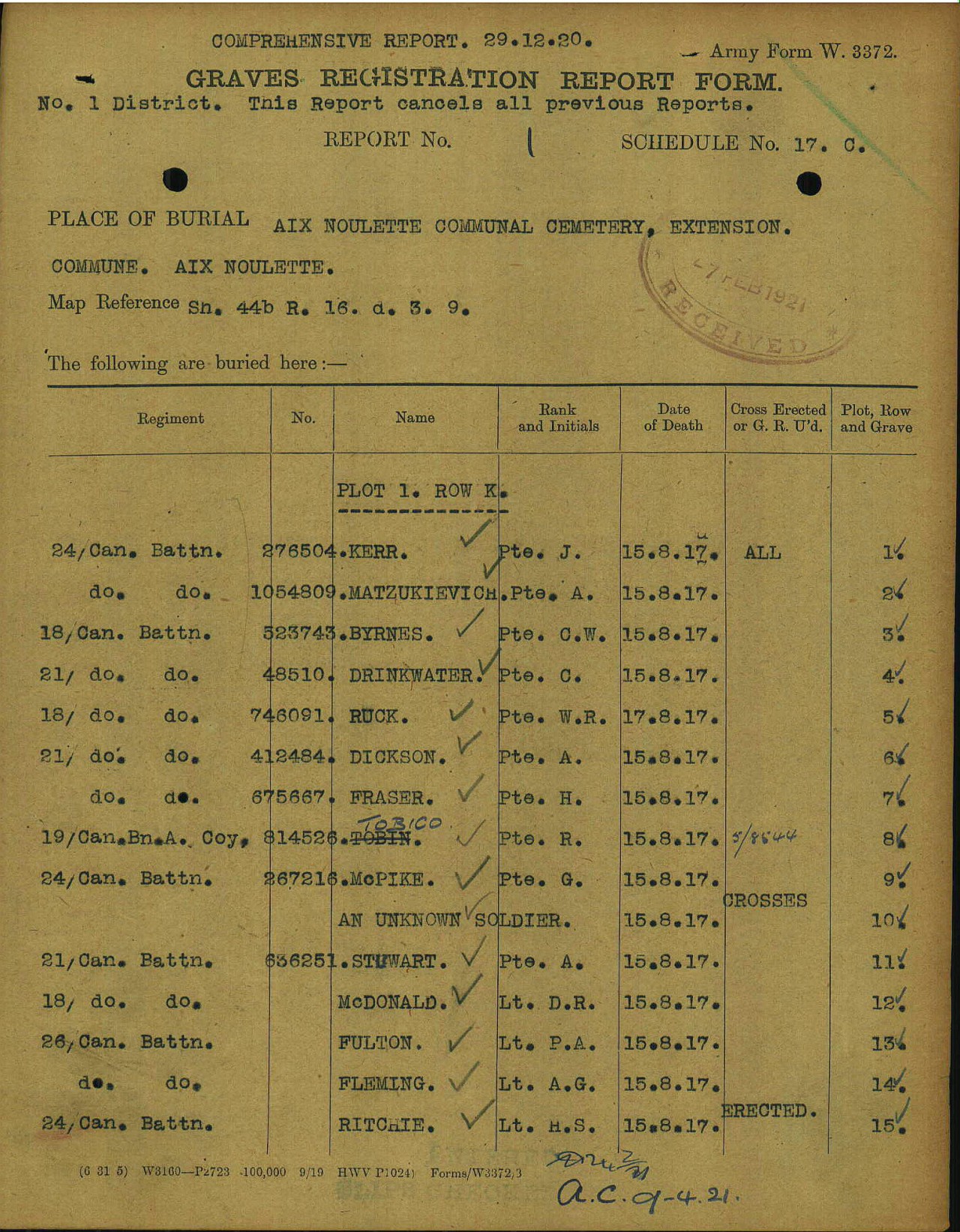 Graves Registration Forms: Grave Registration Reports (GRRs) are standard forms which detail graves for which the Commission is responsible within a particular burial ground. They provide basic details of the individuals, such as name, service number, rank, regiment, unit and date of death, and are listed in Plot, Row and Grave order. ”
